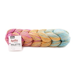Palette 'Hand Painted Yarn' est un écheveau en Édition Limitée composée d'un fil 100% au print multicolore unique et exclusif, obtenu grâce à une technique artisanale de teinture à la main. Comme il s'agit d'un imprimé manuel, l'effet chromatique diffère légèrement d'un écheveau à l'autre. Chaque écheveau de Palette est donc unique. Non seulement le processus de production de ce fil est assez créatif et unique, mais le format de Palette est nouveau : l'écheveau-tresse (Skein Braid). Ce format spécial vous permet de tricoter facilement, sans que le fil s'emmêle et sans avoir à en faire une pelote avant de commencer. L'écheveau-tresse se compose de 7 parties "enchaînées" l'une à l'autre : coupez le fil fin qui unit la tresse, séparez la première partie du reste de l'écheveau et tricotez-la jusqu'à la fin. Répétez la même opération avec chacune des parties de l'écheveau pour le tricoter entièrement. Si vous voulez tricoter un châle unique et coloré, un seul écheveau de 200 grammes de Palette vous suffit.